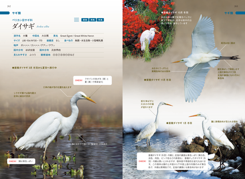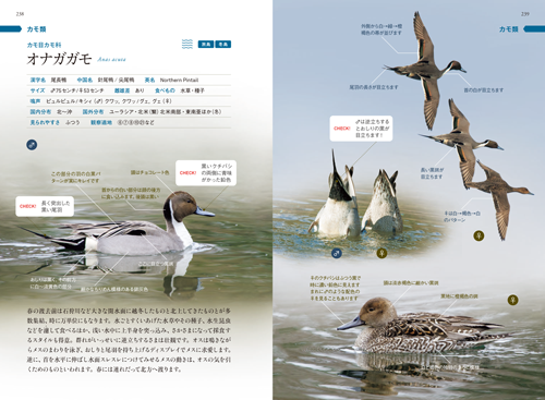 図鑑によって鳥の並べ方(掲載順)はそれぞれです。(中略)初心者から中級者を対象とする本書は、あえて学術的な配列にはこだわりませんでした。スタートは身近な鳥の代表選手であるスズメからとし、「緑地の鳥」(99種)と「水辺の鳥」(24種)を、それぞれの鳥が属する46のグループ(仲間)ごとにまとめています。
