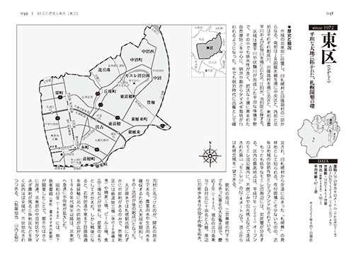 Ⅰ部では、区ごとに「歴史と概況」とマップで区の全体像を解説し、すべての行政地名を網羅して豊富な写真とともに紹介。そのほか通称地名も「その他の地名」として一部を取り上げました。 またⅡ部では、「先住民族アイヌの暮らしと地名」など13のテーマ別に、さまざまな視点から札幌の地名を深掘りします。