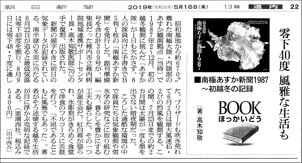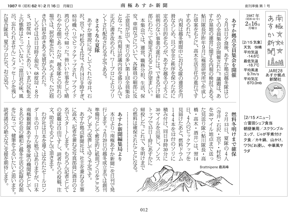 そうした和気あいあいとした雰囲気の中で生まれたのが「南極あすか新聞」で、1987年2月16日から同年12月21日にかけて計305号が日刊で発行された。主筆は医療の高木隊員が務め、主筆の不在時は全員が代筆や投稿で支えた。その結果「南極あすか新聞」は公式の越冬報告だけでは伝えきれない、あすか隊の全記録となったのである。