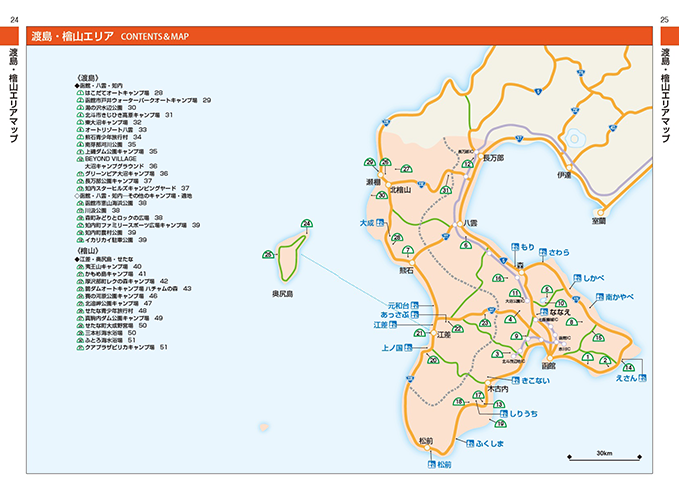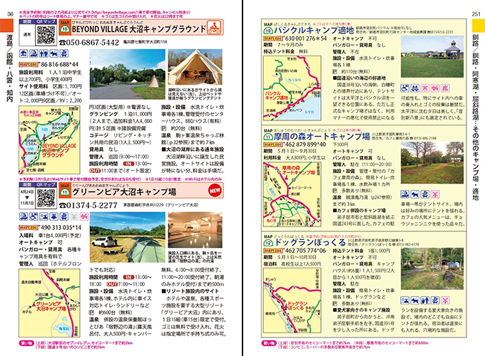 グーグルマップにリンクする便利なQRコードを追加掲載! 各施設の写真や場内図、禁止事項のアイコン、ルートマップなど豊富な図版とデータでガイド。人気の焚き火台使用可否や無料車中泊の可否、Wi-Fiの有無などもアイコンでチェックが可能。さらに、近場の入浴施設や買い物情報(欄外下)も盛り込み、キャンプ旅をバックアップします。