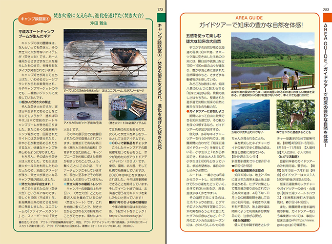 各エリアの冒頭には、その地域でおすすめのグルメや買い物の立ち寄り情報を掲載。さらに、アウトドアや北海道旅の達人たちによるアウトドアコラム「キャンプ談話室」や、各地のネイチャー&観光情報「AREA GUIDE」などの読み物も掲載しました。