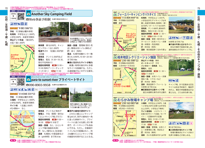各施設の写真や場内図、禁止事項のアイコン、ルートマップ、GoogleマップにリンクするQRコードなど豊富な図版とデータでガイド。予約の可否や予約方法、人気の焚き火台使用可否や無料車中泊の可否、Wi-Fiの有無などもアイコンでチェックが可能。さらに、近場の入浴施設や買い物情報(欄外下)も盛り込み、キャンプ旅をバックアップします。