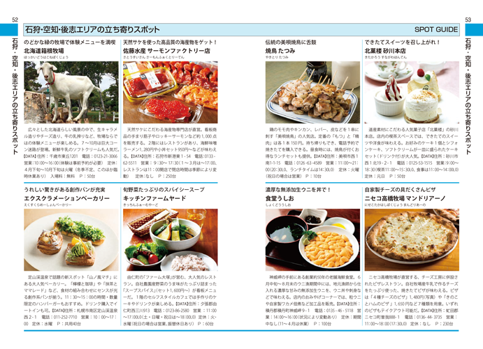 各エリアの冒頭には、その地域でおすすめのグルメや買い物の立ち寄り情報を掲載。さらに、アウトドアや北海道旅の達人たちによるアウトドアコラム「キャンプ談話室」や、各地のネイチャー&観光情報「AREA GUIDE」などの読み物も掲載しました。